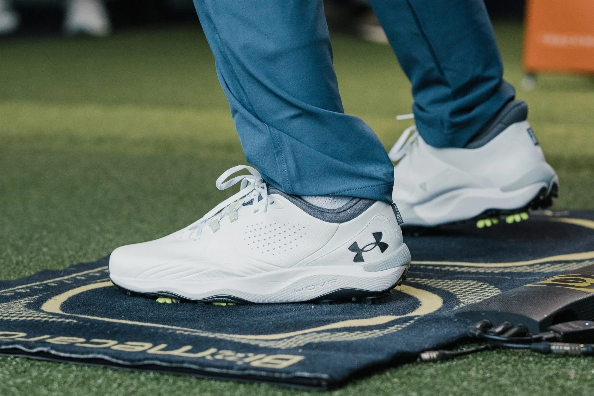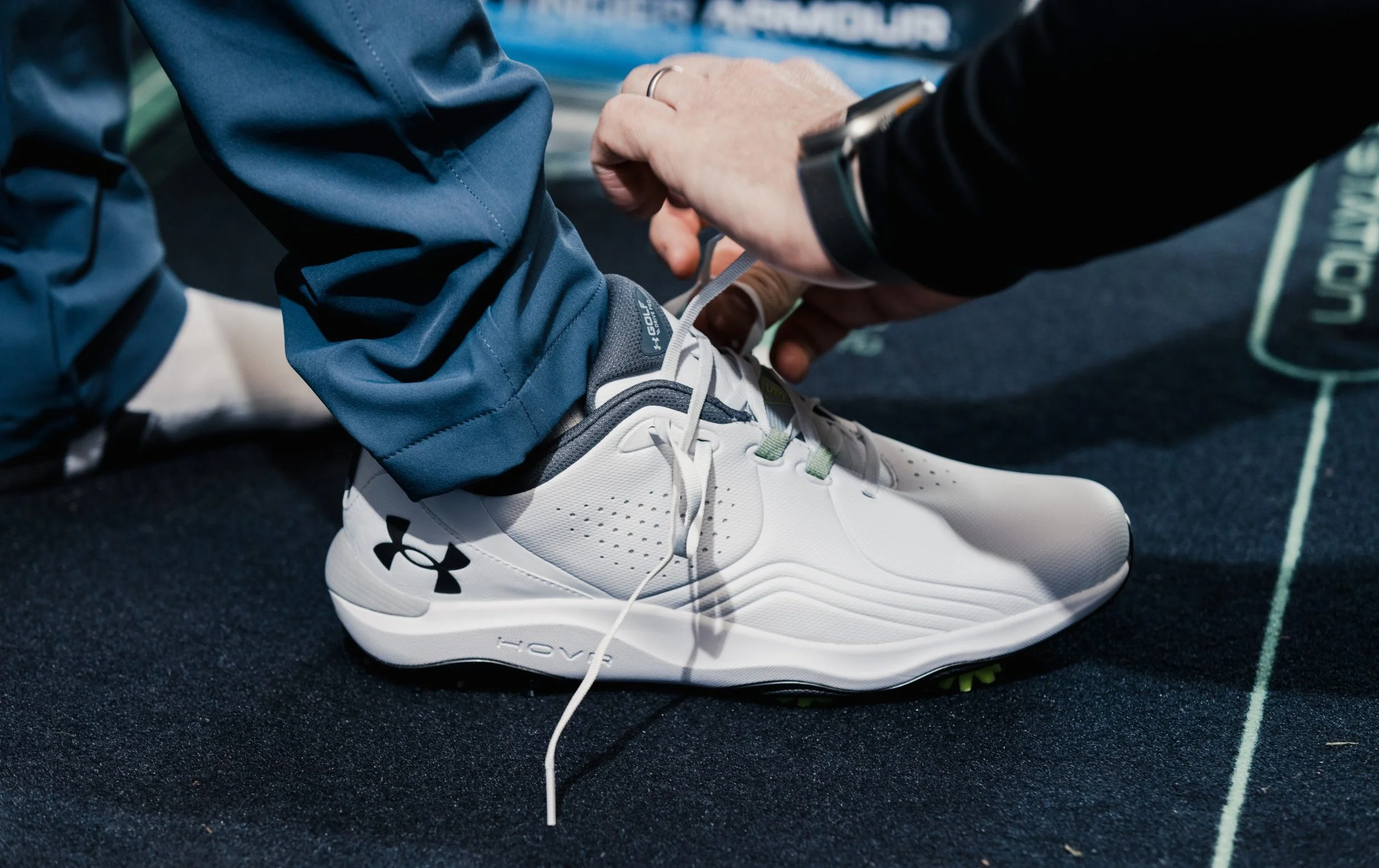 After understanding my swing dynamics and the data collected, it was time to try on the Dry Pro Spike Shoe from Under Armour. Chris explained that this model is designed for maximum support and stability, which is exactly what I needed. The lacing system used in these shoes is inspired by trail running, ensuring a snug fit that connects the midfoot to the shoe.